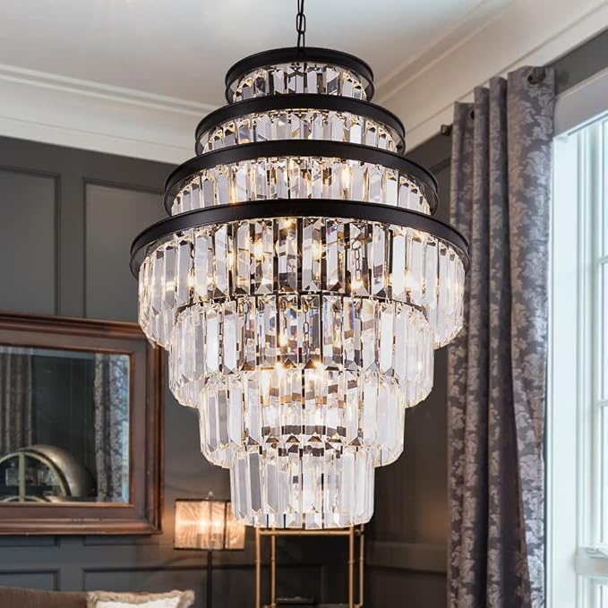 Wellmet 7-Tier Large Vintage Black Crystal Chandelier is a luxury statement piece featuring a black metal frame and premium K9 crystals. Its cascading 7-layer design creates a stunning sparkle, perfect for living rooms, foyers, or dining areas. It supports 8×E12 bulbs (LED/halogen/incandescent), is dimmable, and comes with an adjustable chain, making it ideal for high ceilings.
