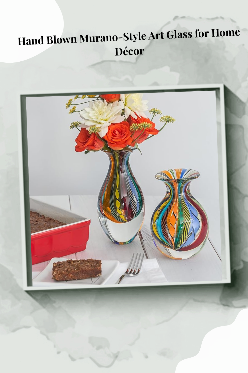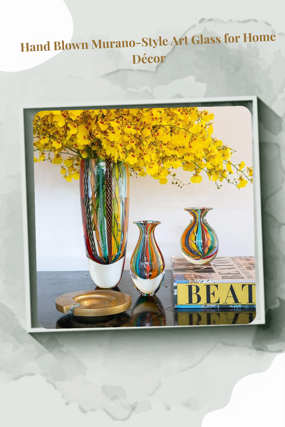 Ca D’Oro Glass Vase Boho with Colored Canes, Hand Blown Murano-Style Art Glass for Home Décor